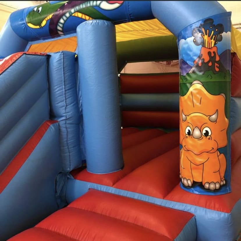 Monster Inflatables new Dinosaur themed bouncy castle with slide.