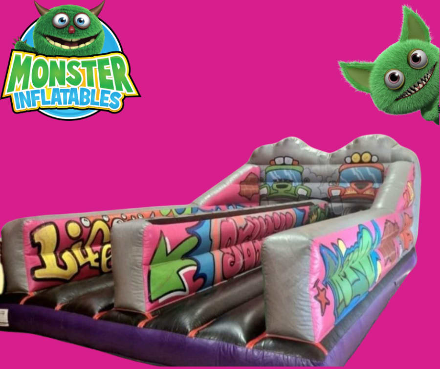 Looking for an exhilarating way to entertain kids at your next event? The Graffiti 2 Lane Bungee Run is the ultimate crowd-pleaser, designed to provide endless excitement and laughter. Perfect for school fun days, fairs, and corporate events, this inflatable attraction is sure to be a hit among children up to 12 years of age. Watch as young participants race against each other, testing their strength and agility in a colorful, graffiti-themed arena. Why not add one of our assault courses, inflatable slides or party extras to your event.