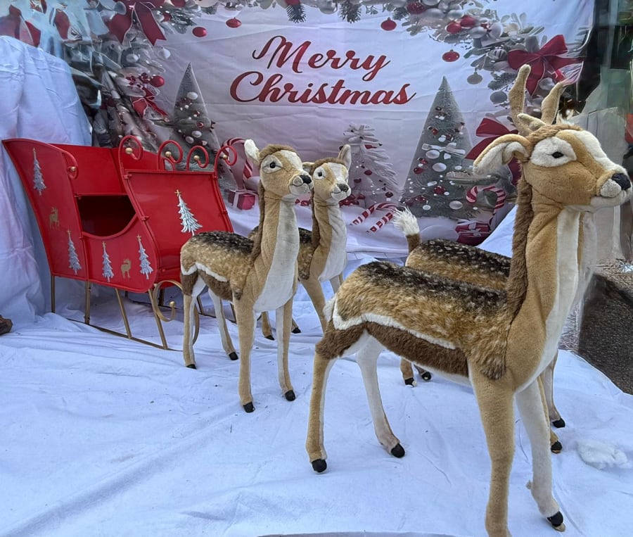 The sleigh and reindeer set is designed to be both decorative and interactive. While the sleigh is primarily a display piece, it can serve as a photo opportunity prop for guests, creating memorable festive pictures. The fluffy reindeer add charm and realism, helping to transport your audience into a true winter wonderland theme.