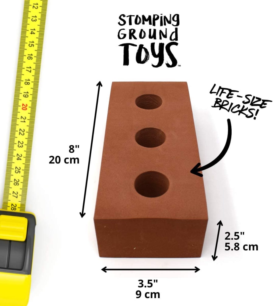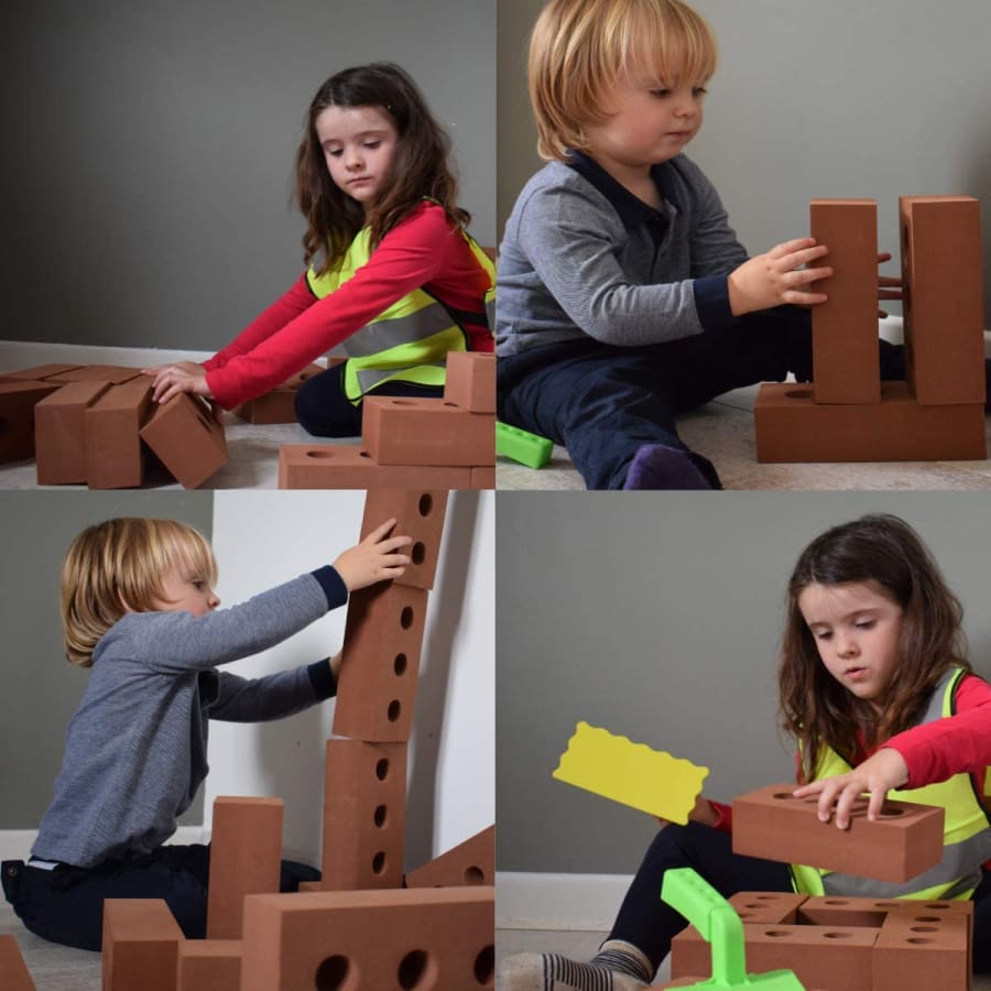 Each brick is full sized, measuring 3½” x 8” x 2½” (9cm x 20cm x 5.8cm) and crafted from brick coloured foam rubber that is soft, safe and BPA-free. That means that they’ll get an authentic building experience without any of the weight and with no risk of hurting themselves. The bricks are all wipe clean so you can be sure they’re safe, and we replace them regularly so that they arrive like new.