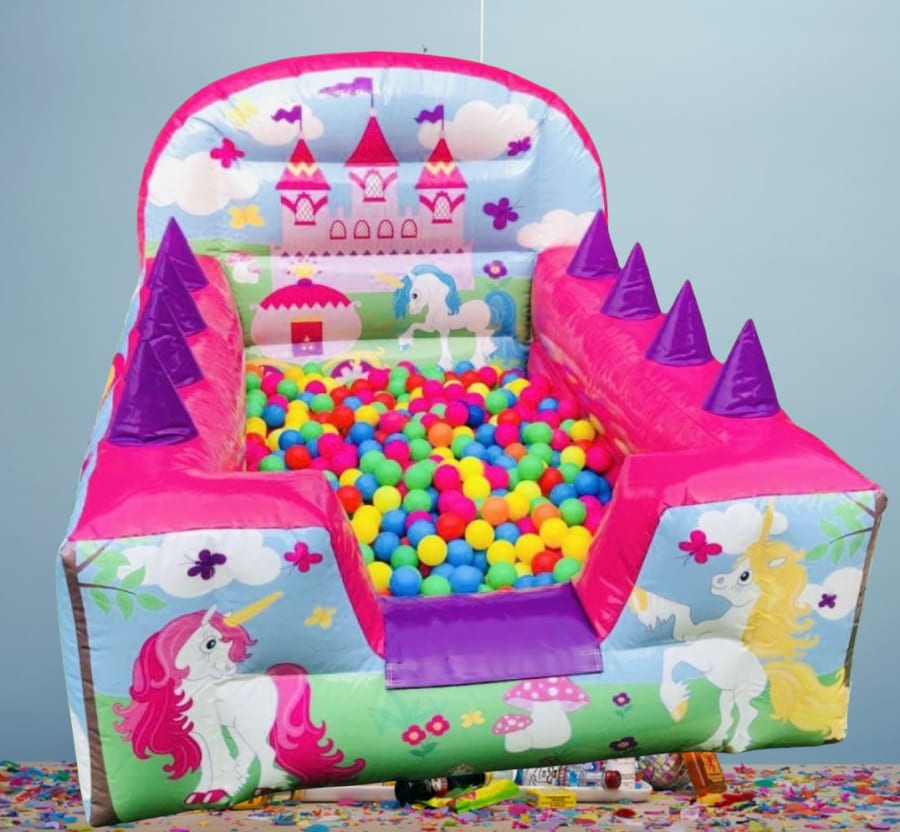 The unicorn ball pit (also known as a unicorn ball pool) works great on its own for a handful of kids, or you can partner it with other items from our extensive unicorn range such as a unicorn bouncy castle, a thrilling unicorn bounce and slide or some unicorn soft play. You could even hire some toddler rocking horses for them to act out their royal adventures. The only limit is their imagination, so get in touch today to create your unique unicorn party package deal.