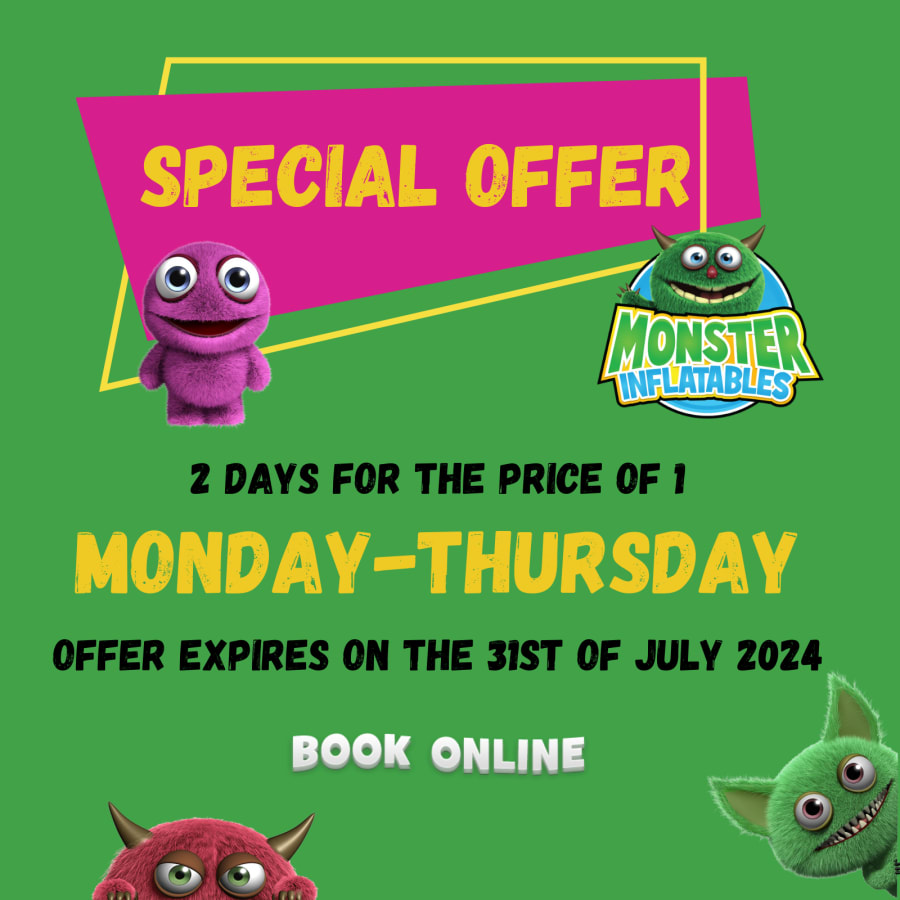 2 days for the price of 1 on any of our inflatables, games, soft play or party extras if booked in June or July 2024 for delivery in August 2024.