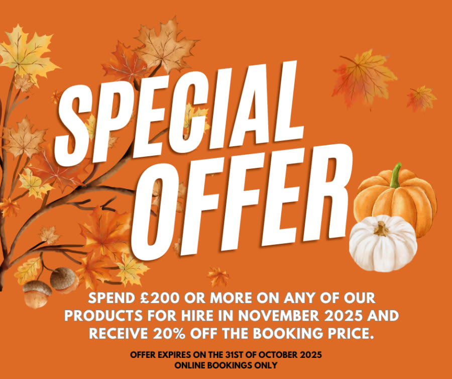 Spend £200 or more on any of our products for hire in November 2025 and receive 20% off.the booking price.