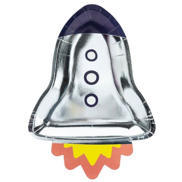 Each plate boasts a striking rocket design, complete with a futuristic, metallic finish that captures the imagination and sets the scene for a stellar party atmosphere. Measuring approximately 21.5cm x 29.5cm, these plates offer ample space for serving up delicious treats and party favourites, ensuring your guests have everything they need to fuel their interstellar journey.