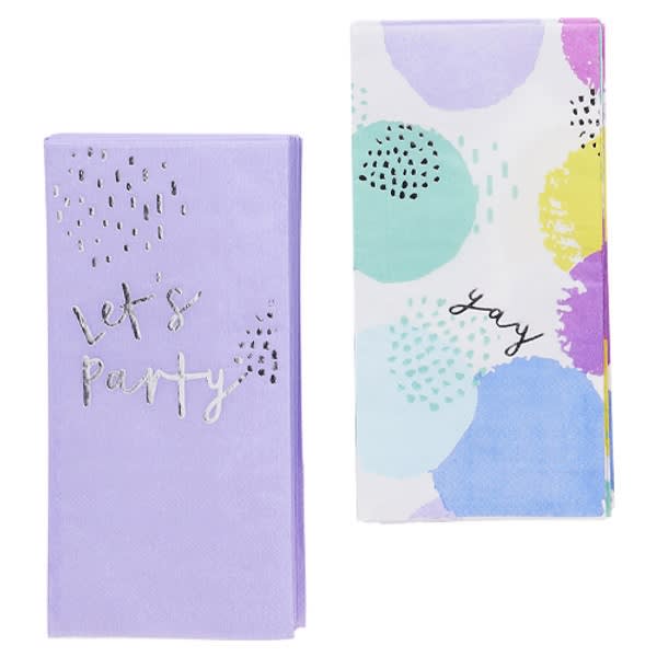 This charming pack includes two distinct designs to mix and match, ensuring your party decor stands out. The first set features a vibrant pastel abstract design adorned with striking silver 'yay' foiling, adding a touch of festivity to any occasion. The second design offers a plain yet sophisticated lilac shade, embossed with 'Let's party' in shimmering silver, ideal for creating a harmonious and elegant table display.